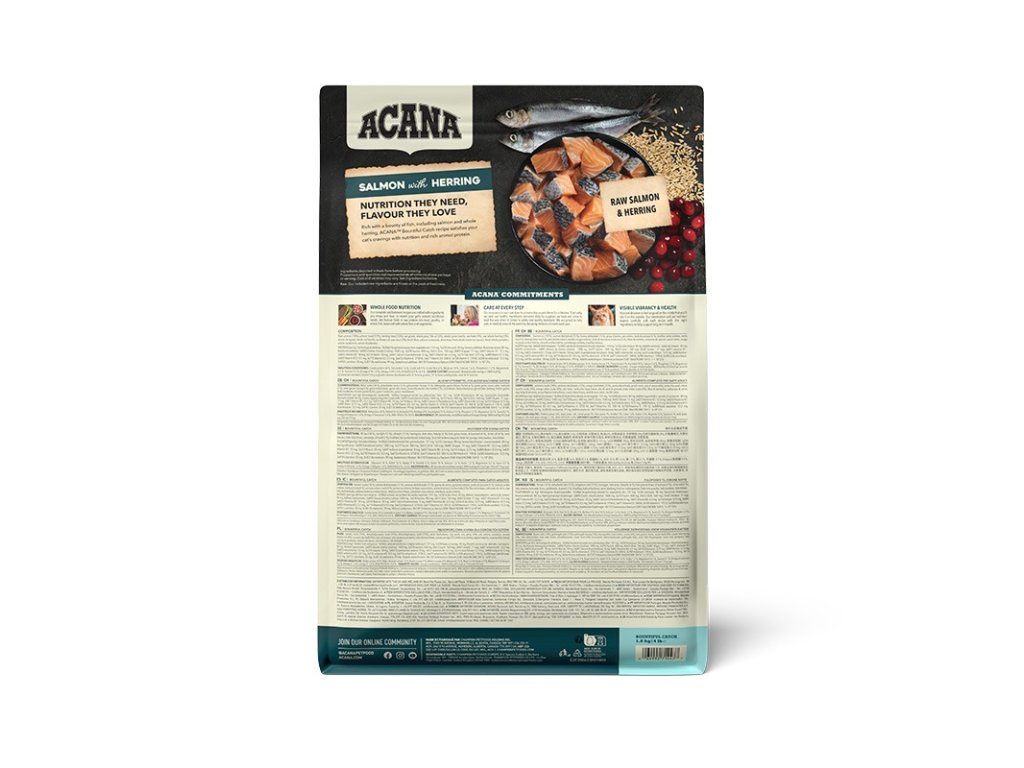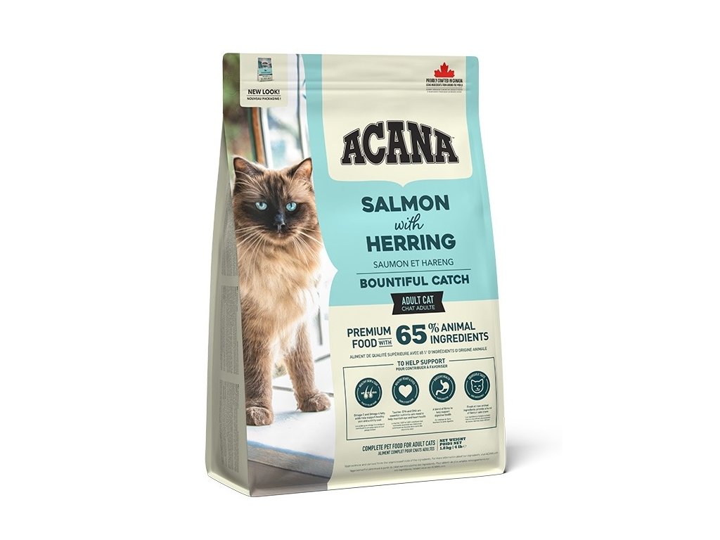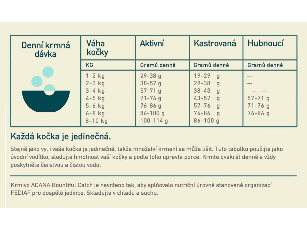 ACANA BOUNTIFUL CATCH CAT - volně lovený losos, pstruh, sleď a hejk Udělejte radost vaší kočce touto skvělou rybí recepturou. NOVINKA ACANA BOUNTIFUL CATCH je nabitá kvalitními rybími ingrediencemi z volně lovených lososů, sleďů a pstruhů v bohatě vyživujícím poměru celé kořisti (maso, orgány a kosti). Tak získává vaše kočka přirozeně potřebné živiny, které ji udržují šťastnou, zdravou a silnou. Díky skvělé chuti si tuto recepturu vaše kočka jednoduše zamiluje! Složení: Syrový losos (15 %), dehydrovaný losos (15 %), dehydrovaný sleď (15 %), oves, hrách, olej z tresky (8 %), zelená čočka, syrový hejk (4 %), syrový sleď (4%), cizrna, červená čočka, vláknina z čočky, syrový duhový pstruh (2 %), olej z lososa (2 %), slunečnicový olej, sušená řasa, čerstvá máslová dýně, čerstvá dýně, čerstvé brusinky, čerstvé borůvky.