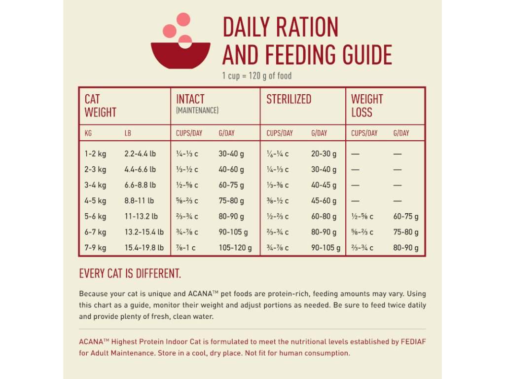 Hrdě vyrobeno v Kanadě za použití těch nejlepších ingrediencí. Složení: Čerstvé kuřecí maso (11 %), syrový losos (9 %), syrový pstruh (9 %), dehydrované kuřecí maso (9 %), dehydrovaná treska (9 %), dehydrovaný sleď (9 %), celé fazole pinto, celý hrách, čerstvé kuřecí droby (játra, srdce, žaludek) (6 %), celá červená čočka, celá cizrna, celá zelená čočka, kuřecí tuk (4 %), syrové krůtí maso (4 %), čerstvá vejce (4 %), mletá ozdobnice, hrachová vláknina, rybí olej (0,5 %), syrová krůtí játra (0,5 %), sušená mořská řasa, celá čerstvá dýně, celá čerstvá máslová dýně, celá čerstvá mrkev, celá čerstvá jablka, celé čerstvé hrušky, celá čerstvá cuketa, sušený kořen čekanky, čerstvá kapusta, čerstvý špenát, čerstvé listy tuřínu, čerstvé listy řepy, celé brusinky, celé borůvky, celé plody muchovníku, kořen kurkumy, ostropestřec mariánský, kořen lopuchu, levandule, kořen proskurníku, šípky.Doplňky (na kg): Technologické doplňky: 1b306(i) extrakt tokoferolu z rostlinných olejů: 121 mg, 1a330 kyselina citrónová: 40 mg. Smyslové doplňky: extrakt z rozmarýnu: 80 mg. Výživové doplňky: 3a890 cholin chlorid (cholin): 2 100 mg, 3a370 taurin: 400 mg, 3b612 (zinek: 150 mg), 3b407 (měď: 10 mg), 3a821 vitamin B1: 12,5 mg, 3a825i vitamin B2: 10 mg, 3a314 niacin: 50 mg, 3a841 D pantothenát vápenatý: 8 mg, 3a831 vitamin B6: 6,5 mg, 3a316 kyselina listová: 0,75 mg, 3a880 biotin: 0,13 mg, 3a835 vitamin B12: 0,1 mg, 3a710 vitamin K3: 0,5 mg, 3a672a vitamin A: 3 750 IU, 3a671 vitamin D3: 500 IU, 3a700 vitamin E: 170 IU, 3a300 kyselina askorbová: 12,5 mg, 3c301 DL methionin: 99 mg.Analytické složky: hrubý protein 38 %, obsah tuku 14 %, hrubý popel 9 %, hrubá vláknina 6 %, vlhkost 10 %, vápník 1,3 %, fosfor 1,1 %, hořčík 0,1 %, taurin 0,2 %, omega 6 mastné kyseliny 3 %, omega 3 mastné kyseliny 1 %, DHA 0,3 %, EPA 0,2 %. OBSAH KALORIÍ (vypočítaný): Metabolizovatelná energie je 3 630 kcal/kg (436 kcal na odměrku 250 ml/120 g).