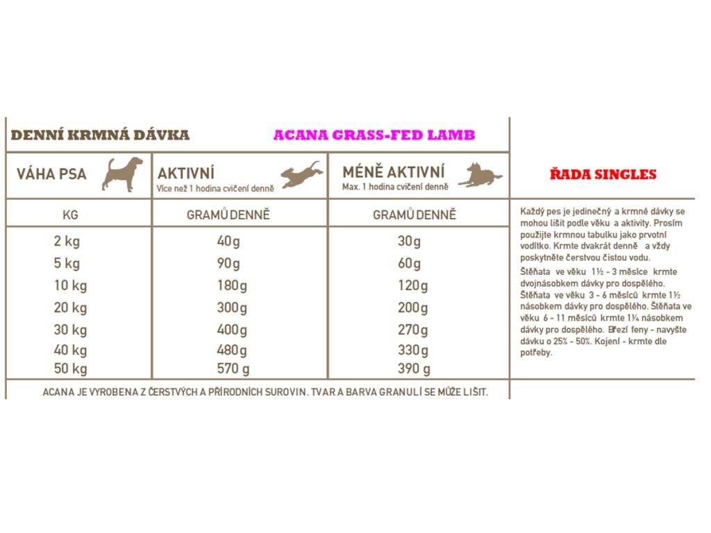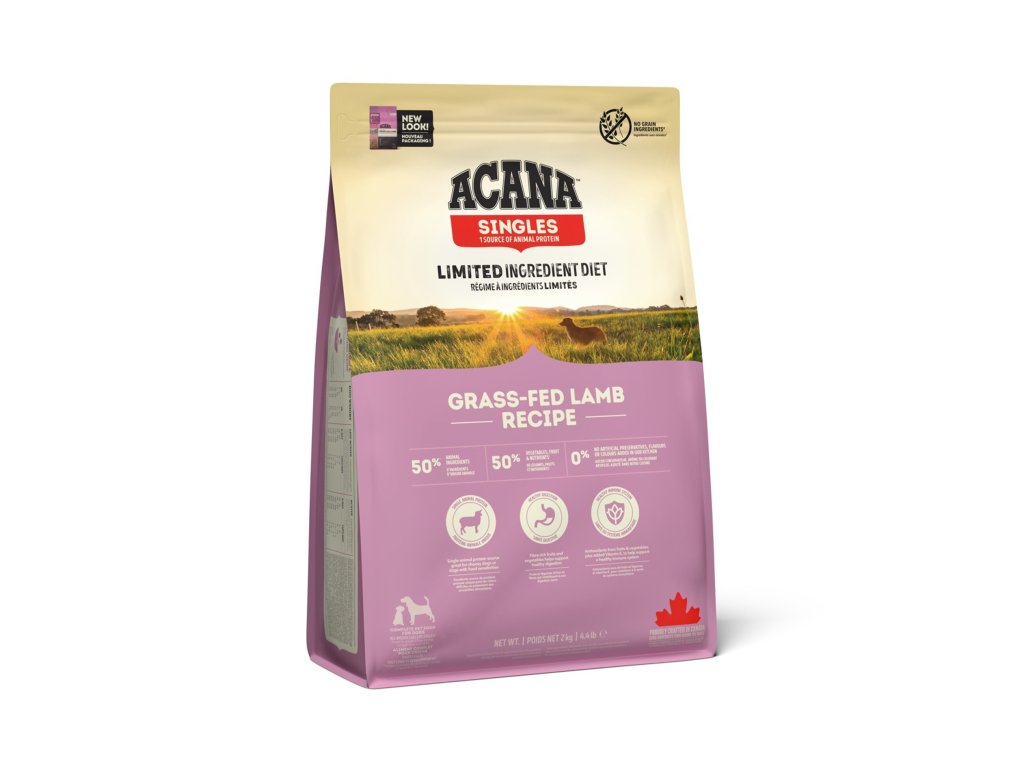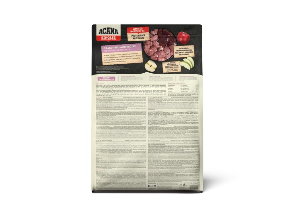 Polovina masa v krmivu Acana Singles je čerstvá nebo syrová. To znamená, že dodává živiny přirozenou cestou. Druhá polovina je v dehydrované formě, což dodává koncentrovaný zdroj proteinů z masa. Acana Grass-fed Lamb je krmivo s jediným zdrojem živočišného proteinu. Jehněčí chované na Novozélandských rančích je dodáváno v podílu celé kořisti. Krmivo tedy obsahuje nejen maso, ale i orgány a chrupavky, díky čemuž eliminujeme nutnost dodávat umělé doplňky.