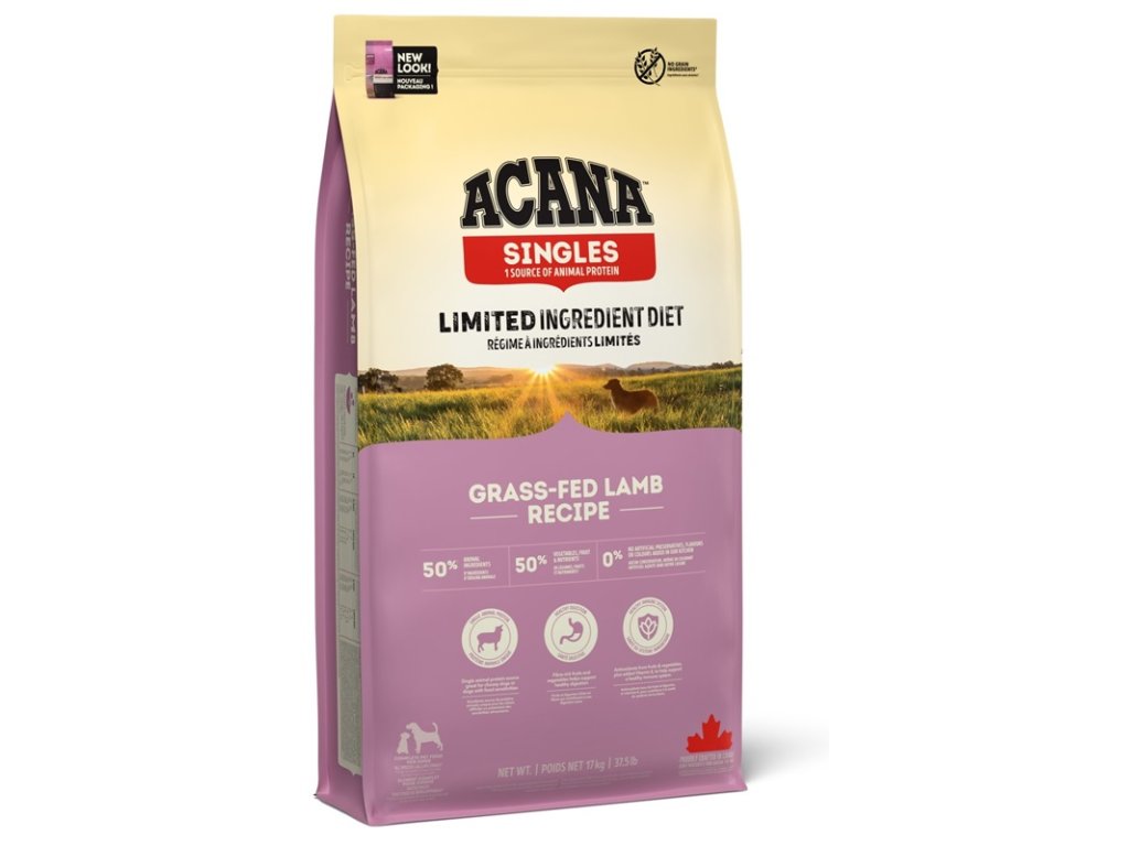 Polovina masa v krmivu Acana Singles je čerstvá nebo syrová. To znamená, že dodává živiny přirozenou cestou. Druhá polovina je v dehydrované formě, což dodává koncentrovaný zdroj proteinů z masa. Acana Grass-fed Lamb je krmivo s jediným zdrojem živočišného proteinu. Jehněčí chované na Novozélandských rančích je dodáváno v podílu celé kořisti. Krmivo tedy obsahuje nejen maso, ale i orgány a chrupavky, díky čemuž eliminujeme nutnost dodávat umělé doplňky.