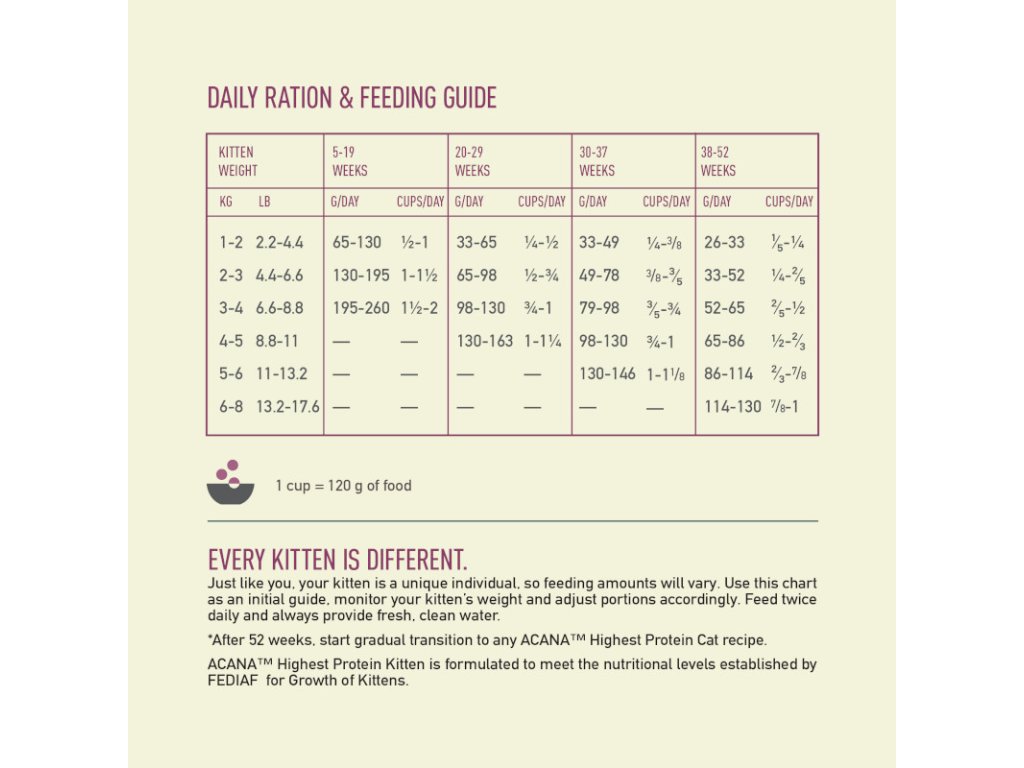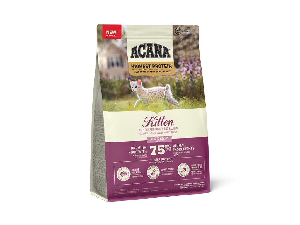 Receptura ACANA™ Highest Protein Kitten je naše nejbohatší krmivo pro koťata na bílkoviny!Ideální pro milovníky zvířat, kteří chtějí podpořit růst svého kotěte vyšším obsahem živočišných bílkovin. Toto krmivo bylo vyvinuto veterináři a odborníky na výživu zvířat tak, aby poskytovalo vyváženou výživu pro koťata.Je vyráběno v naší špičkové kuchyni v Kanadě z nejkvalitnějších surovin na světě, včetně čerstvého nebo syrového kuřete, krůty a lososa, a neobsahuje obiloviny.Toto krmivo pro koťata ACANA Highest Protein Kitten má tyto klíčové vlastnosti: