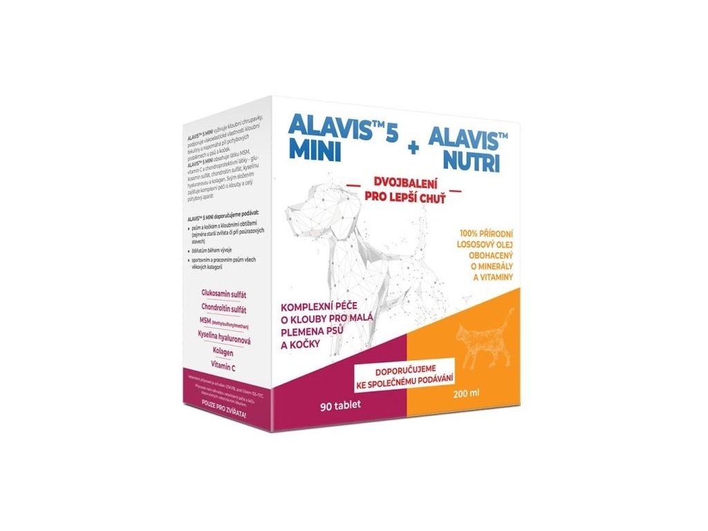 Alavis 5 Mini vyživuje kloubní chrupavky, podporuje promazávací vlastnosti kloubní tekutiny, napomáhá při pohybových problémech u psů a koček. Obsahuje všechny důležité látky, které se v kloubech, pojivových tkáních a chrupavce běžně vyskytují a umožňuje tak komplexní péči o pohybový aparát.