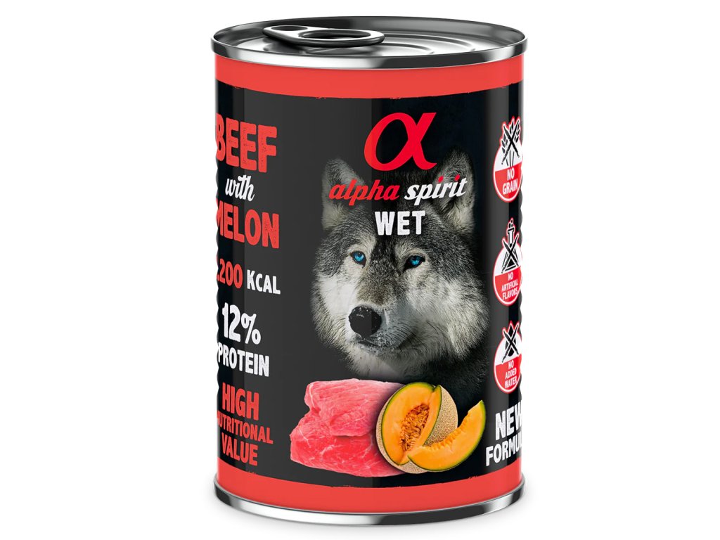 Konzerva Alpha Spirit plná čerstvého hovězího masa s melounem pro všechny dospělé psy.