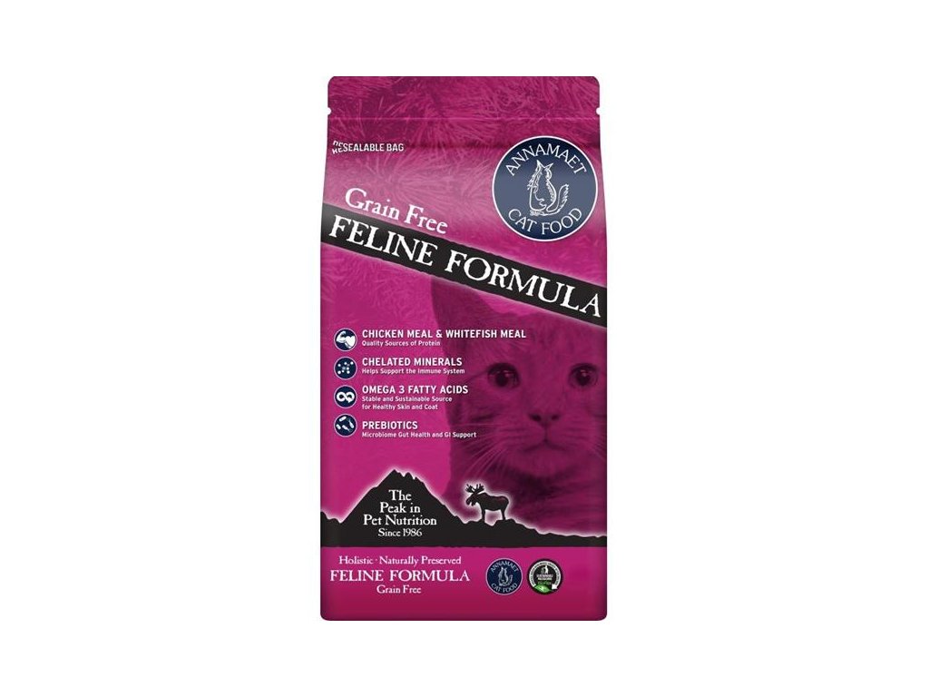 Annamaet Grain Free Feline je receptura vyráběná zcela bez použití obilovin, věrná masožravému původu koček. Vyrábí se z bílých mořských ryb z volného oceánu a kuřat chovaných bez použití antibiotik a hormonů. Díky tomu obsahuje velké množství kvalitních bílkovin a tuků.Krmivo je určené pro kočky ve všech životních stádiích.