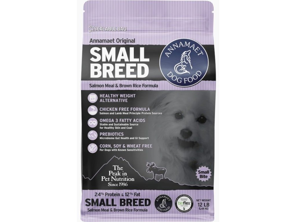 Krmivo Annamaet Original Small Breed Salmon je receptura z lososa a jehněčího masa splňující nutriční potřeby psů malých a toy plemen ve všech životních stadiích – je vhodné pro štěňata, březí a kojící feny i dospělé psy. Jde o alternativu ke kuřecí receptuře Annamaet Small Breed Chicken, oproti níž má nižší obsah tuku.
