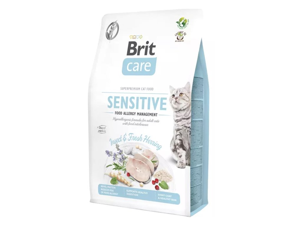 Kompletní krmivo pro dospělé kočky. Bezobilná hypoalergenní receptura pro kočky s potravinovou intolerancí. Bohatá na Omega-3 a Omega-6 mastné kyseliny pro zdravou kůži a lesklou srst. Hmyzí protein podporuje zdravé trávení a snižuje riziko potravinových alergií. Nový udržitelný zdroj proteinu s nízkou uhlíkovou stopou. Složení:čerstvý sleď (26 %), žlutý hrách (23 %), dehydrovaný sleď (20 %), dehydrovaný hmyz (14 %), kokosový olej (konzervovaný tokoferoly, 8 %), olej ze sleďů (2 %), přírodní chuť hydrolyzovaných jater (2 %), sušená jablka (2 %), lněné semínko (1 %), sušený srdečník (0,5 %), sušený heřmánek (0,5 %), hrachová mouka, sušený rakytník řešetlákový (0,3 %), sušené brusinky (0,2 %), frukto-oligosacharidy (0,015 %), mannan-oligosacharidy (0,015 %), juka schidigera (0,008 %), Lactobacillus acidophilus HA – 122 inaktivováno (15x109 buněk/kg). Analytické složky:hrubý protein 34,0 %, hrubý tuk 16,0 %, hrubá vláknina 1,2 %, hrubý popel 8,2 %, vlhkost 10,0 %, omega-3 mastné kyseliny 0,8 %, omega-6 mastné kyseliny 2,2 %, vápník 1,1 %, fosfor 0,8 %, sodík 1,0 %, hořčík 0,1 %. Nutriční složení:vitamín A (3a672a) 20000 IU, vitamín D3 (3a671) 800 IU, vitamín E (3a700) 600 mg, vitamín C (3a312) 300 mg, taurin (3a370) 2500 mg, L-karnitin (3a910) 50 mg, cholinchlorid (3a890) 2500 mg, biotin (3a880) 2 mg, vitamín B1 (3a821) 10 mg, vitamín B2 (3a825i) 12 mg, niacinamid (3a315) 50 mg, D-pantothenan vápenatý (3a841) 40 mg, vitamín B6 (3a831) 10 mg, kyselina listová (3a316) 2 mg, vitamín B12 0,04 mg, zinek (3b606) 120 mg, železo (3b106) 45 mg, mangan (3b504) 55 mg, jodid draselný (3b201) 4 mg, měď (3b406) 10 mg, selen (3b810) 0,2 mg, L-methionin 2000 mg. Obsahuje přírodní antioxidanty schválené EU: tokoferolové extrakty z rostlinných olejů (1b306(i)), askorbyl-palmitát (1b304) a výtažek z rozmarýnu. Metabolizovatelná energie: 3,860 kcal/kg