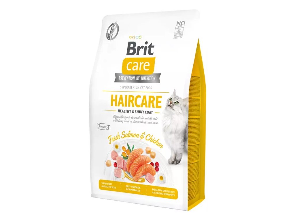 Brit Care Cat Grain-Free Haircare Healthy & Shiny Coat je kompletní krmivo pro všechny dospělé kočky s dlouhou srstí nebo s náročnou péčí o srst. Receptura je bez obilovin a obsahuje čerstvé maso z lososa a kuřete. Granule mají neodolatelnou chuť a vůni, vhodné jsou tak i pro ty nejvybíravější kočky.