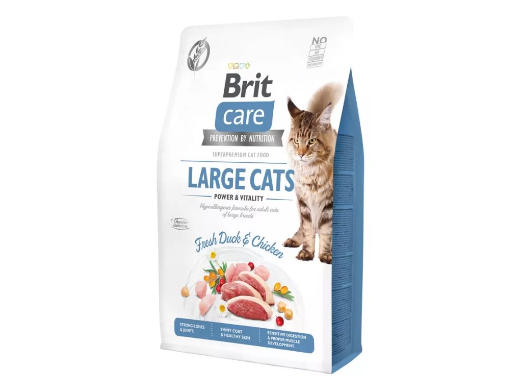 Brit Care Cat Grain-Free Large cats Power & Vitality je kompletní krmivo pro dospělé kočky velkých plemen. Hypoalergenní receptura obsahuje čerstvé kachní a kuřecí maso.