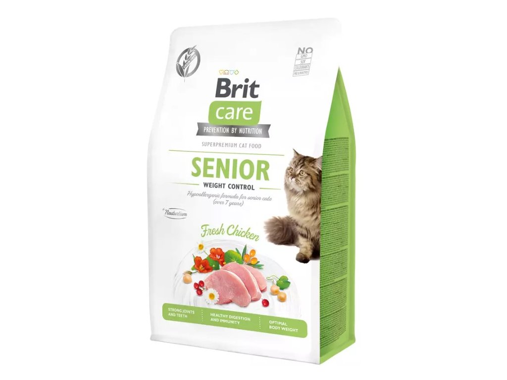 Brit Care Cat Grain-Free Senior Weight Control je kompletní krmivo pro kočky starší 7 let. Hypoalergenní receptura obsahuje čerstvé kuřecí maso. Granule jsou velmi chutné - vhodné i pro vybíravější jedince. Benefity krmiva: