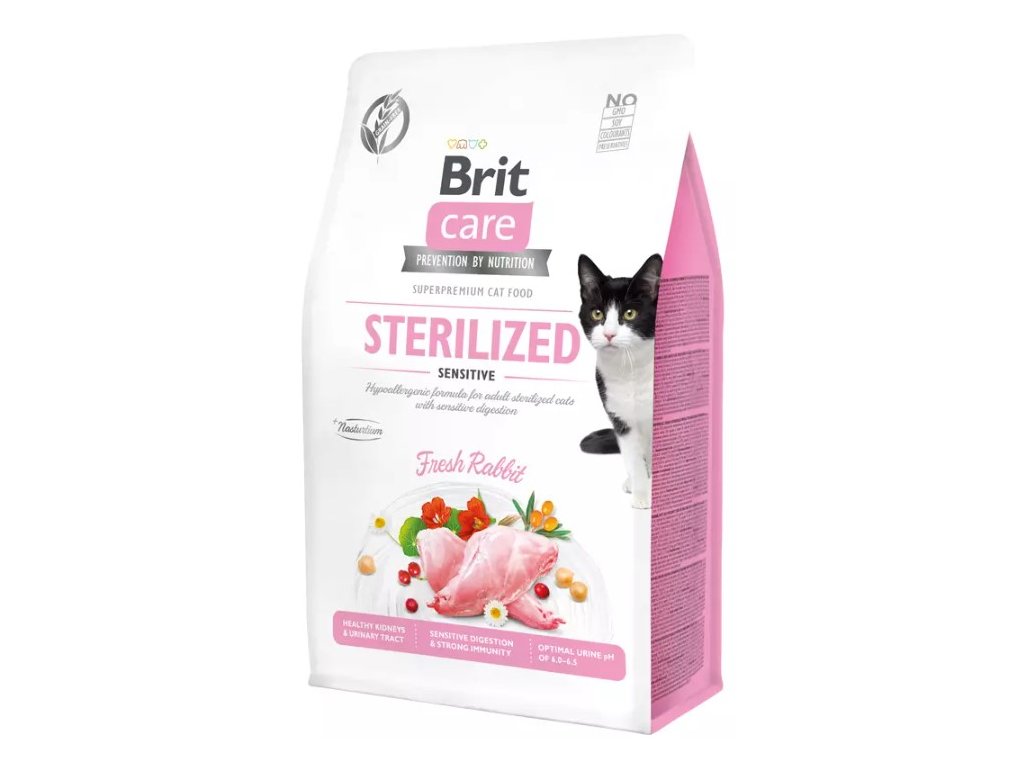 Brit Care Cat Grain-Free Sterilized Sensitive je kompletní krmivo pro kastrované kočky s citlivým zažíváním. Hypoalergenní receptura obsahuje čerstvé králičí maso. Benefity krmiva: