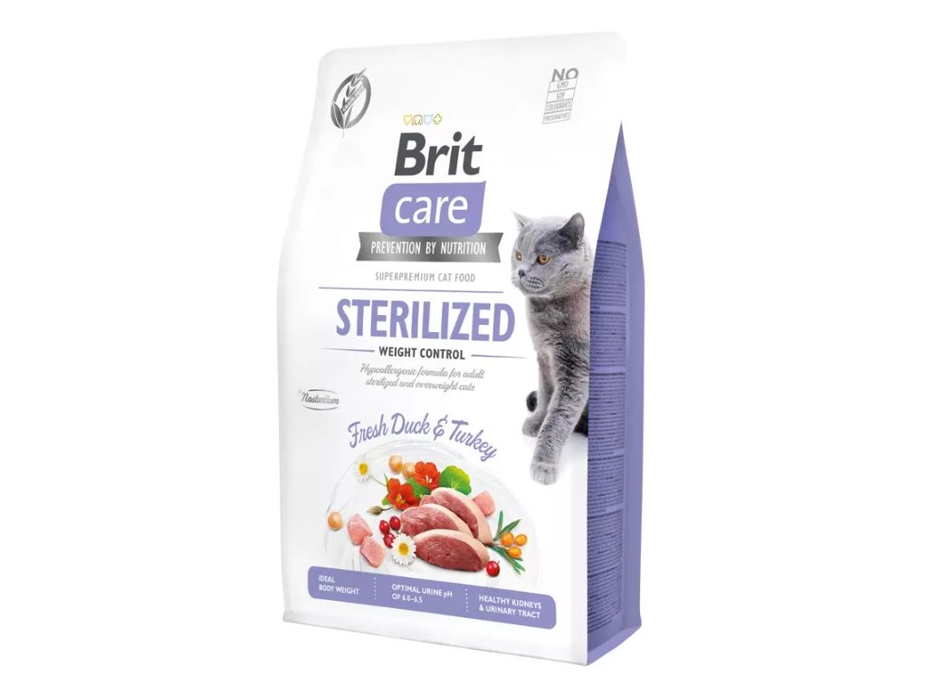 Brit Care Cat Grain-Free Sterilized Weight Control je kompletní krmivo pro kastrované kočky. Receptura obsahuje čerstvé kachní a krůtí maso a je zcela bez obilovin.Benefity krmiva