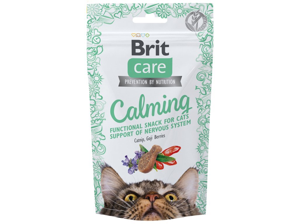 Doplňkové krmivo Brit Care Cat je vyrobeno v EU a drobné snacky jsou určeny pro kočky, u kterých se projevuje nervové onemocnění nebo jsou neklidné. Pochoutky Calming jsou obohaceny o šantu kočičí a goju, které kočičí šelmy zklidňují. Funkční pamlsky pro kočky obsahují protein z kuřete, kuřecí játra a také kolagen.