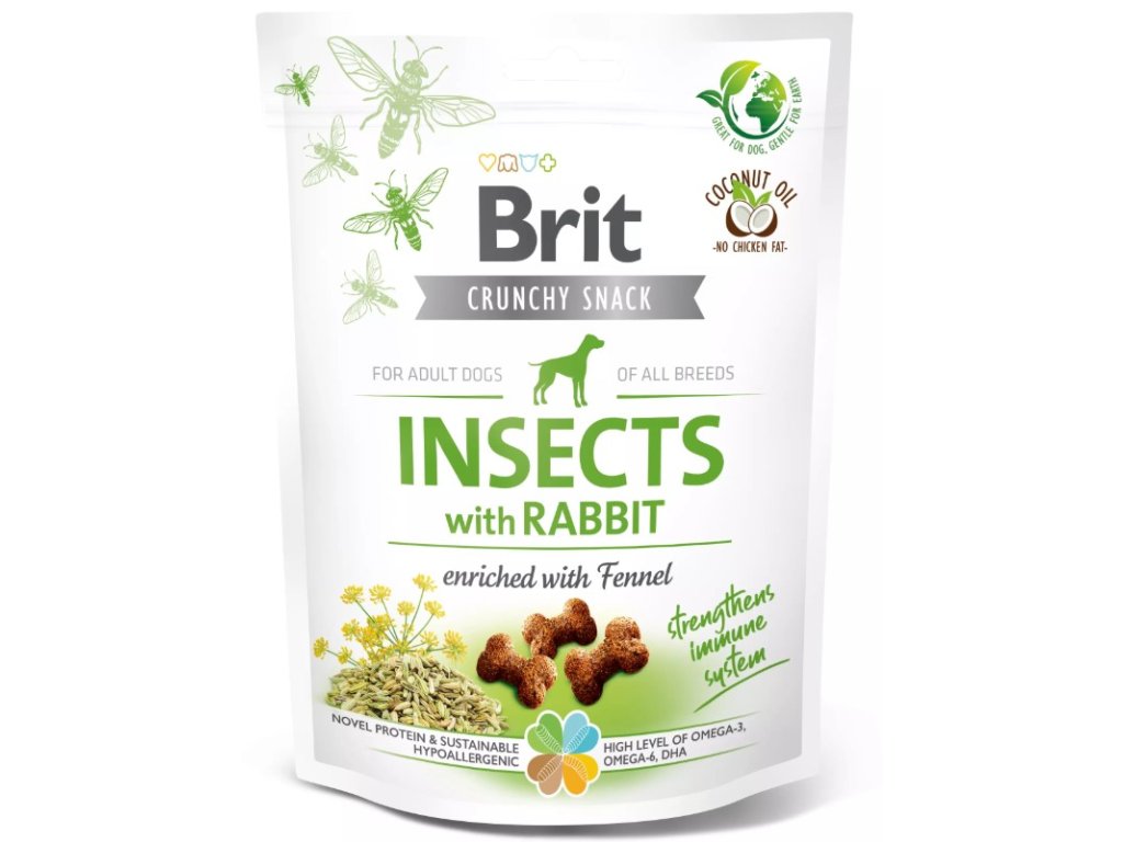 Funkční pamlsky Brit Care Dog Insects with Rabbit & Fennel jsou křupavé pamlsky pro dospělé psy všech plemen. Díky svému složení s hmyzem a králičím masem jsou pochoutky bohaté na proteiny a naopak chudé na tuky. Posilují imunitu, nezatěžují trávení a skvěle chutnají.