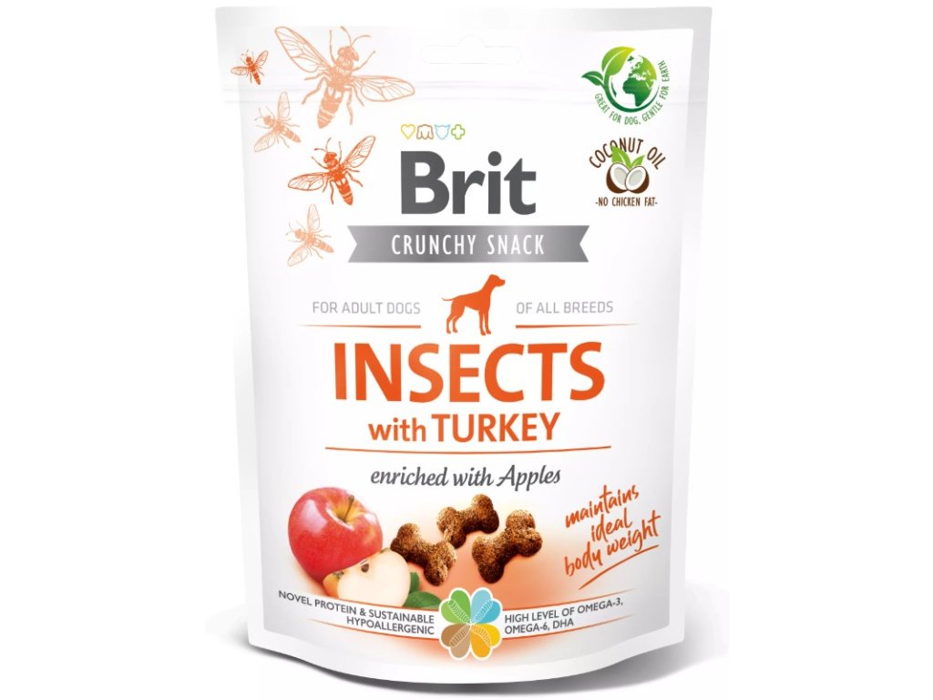 Brit Crunchy Snack - nové křupavé pamlsky pro psí kamarády, které obsahují hmyzí protein obohacený o protein z krůty. Složení je mimo jiné doplněno o zdraví prospěšná jablka. Hmyzí pamlsky pro psy Brit Insect jsou hypoalergenní (vhodné i pro citlivé jedince). Receptura Brit Crunchy Snack Insect & Turkey podporuje ideální tělesnou hmotnost.