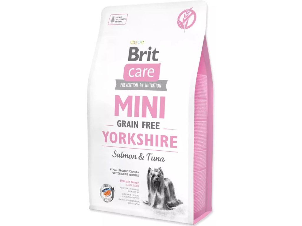 Superprémiové krmivo pro dospělé psy Brit Care Mini Grain-Free je vyrobeno zcela bez obilovin. Granule YORKSHIRE MINI jsou určeny pro dospělé psy plemene jorkšírský teriér. Složení krmiva obsahuje maso ze 2 druhů ryb (losos a tuňák). Granule jsou hypoalergenní a tudíž velmi šetrné k zažívání malých jorkšírů. Ve složení je zahrnut soubor přírodních aditiv, které podporují obranyschopnost. Díky nízkému glykemického indexu je krmivo ideální jako prevence před obezitou.