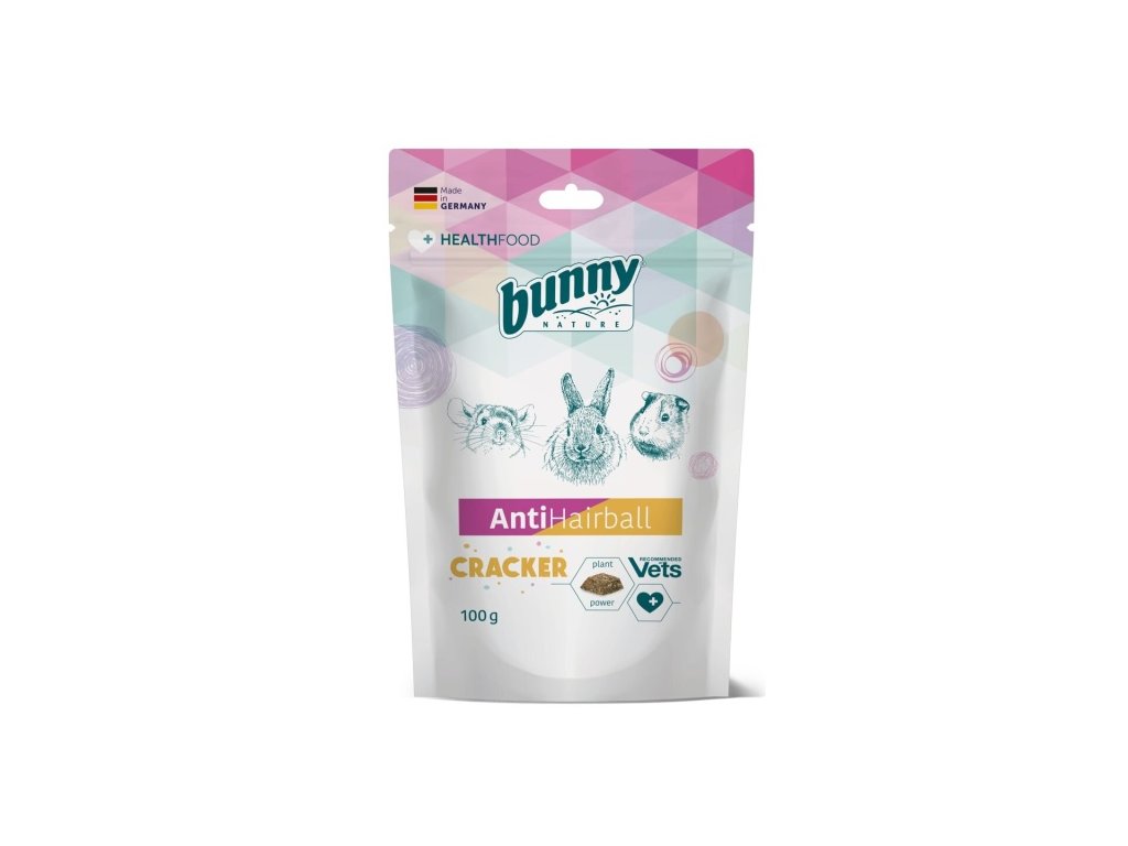 AntiHairball Cracker od Bunny Nature je inovativní doplněk stravy ve formě sušenek, vyvinutý speciálně pro prevenci tvorby trichobezoárů – smotků chlupů v trávicím traktu, které mohou způsobovat zažívací potíže u králíků, morčat a činčil. Díky speciální receptuře s lněným semínkem a papájou tento doplněk podporuje trávení a usnadňuje odstraňování spolknutých chlupů.