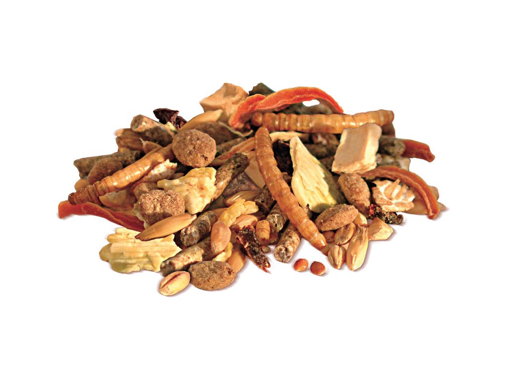 Složení: oves, ječmen, proso žluté, kukuřice, lesknice kanárská, ječné vločky, hrachové vločky, pšenice, pšeničné klíčky, kukuřičné vločky, slunečnicová semena zbavená oleje, mrkev, ovesné vločky, rýže, proso bílé, kuře, vojtěška, travní semena, proso červené, lněná semínka, pastinák, uhličitan vápenatý, pivovarské mláto, mrkvové výlisky, červená řepa, pivovarské kvasnice, živočišný tuk, smetánka lékařská, řebříček, sezam, sleďová moučka, inulin, paprika, jablka, mouční červi, květy heřmánku, slupky ze šípku, karob, extrakt z kuřecích jater, sušená vejce celá, květy slézu, lososový olej, lněný olej, lecitin (obiloviny celkem 54 %, semena 21 %)