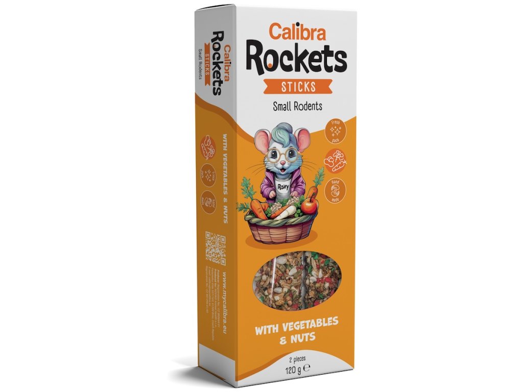 Calibra Rockets Sticks Small Rodents Vegetables & Nuts jsou pochoutkou určenou pro křečky, potkany, myši a další hlodavce. Dvě tyčinky s obsahem zeleniny a buráků jsou plné dalších jejich oblíbených ingrediencí. Tyčinky jsou vyráběné ručně a jsou balené v ochranné atmosféře pro maximální zachování čerstvosti. Tyčinky mají závěsný systém, který umožňuje zavěšení na okraj terária nebo mřížku u klece. Malí kamarádi našich dětí budou Calibra Rockets tyčinky milovat. A dětem určitě udělá radost veselý obal s kreslenými Calibra Rockets postavičkami. Doplňkové krmivo pro křečky, potkany, myši a další hlodavce.  Složení: hrachové vločky, pšeničné vločky, pekařské produkty, pšenice, světlice barvířská, proso, mrkev 4,2 %, podzemnice olejná 4,2 %, čirok, jablka 2,8 %, petržel 2,3 %, kopr 1,5 %, oves nahý, len, škrob.  Analytické složky: hrubý protein 12 %, hrubá vláknina 5 %, hrubé oleje a tuky 4 %, hrubý popel 5,5 %.  Doplňkové látky: barviva schválená EU.   Krmný návod: Podávejte volně jako doplněk k hlavnímu krmivu.  Skladujte v suchu a chladu. Minimální trvanlivost do: viz. obal.