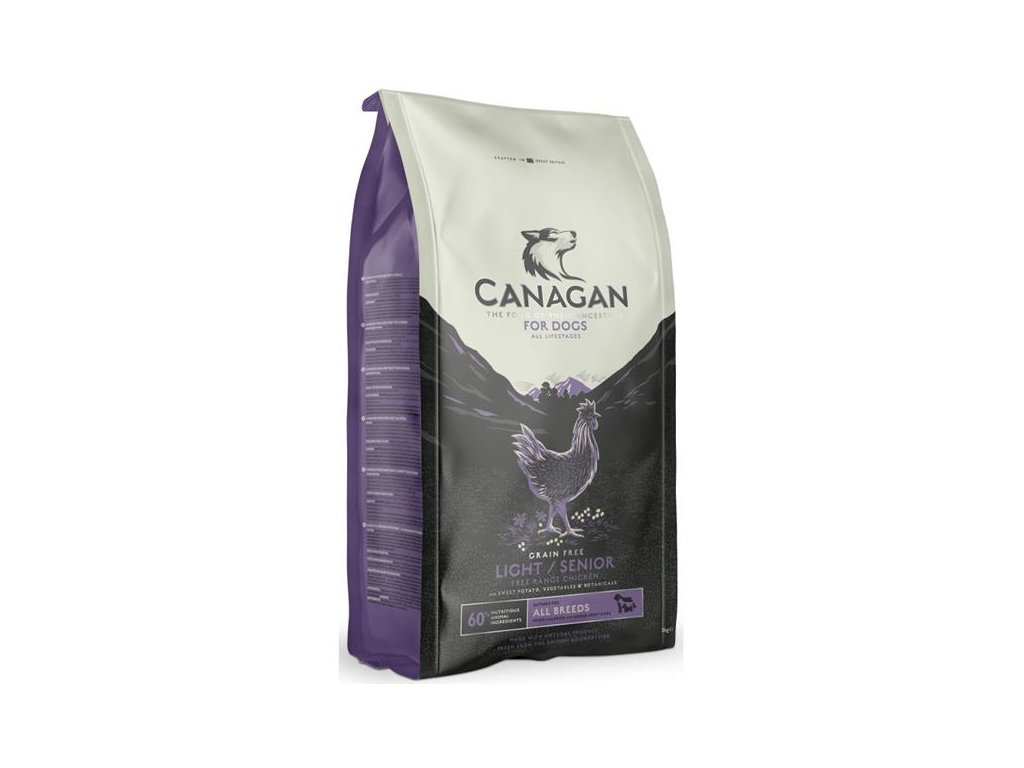Kompletní krmivo Canagan Light / Senior with Free-Run Chicken – je vyrobeno s nízkým obsahem tuků a kalorií speciálně pro potřeby starších psů nebo psů s nadváhou. Vyšší obsah bílkovin zároveň pomáhá udržovat svalovou hmotu. Starší psi i psi s nadváhou mohou mít potíže s klouby, do receptury je proto přidán vyšší obsah látek podporujících zdraví jejich zatěžovaných kloubů (glukosamin, MSM, chondroitin).
