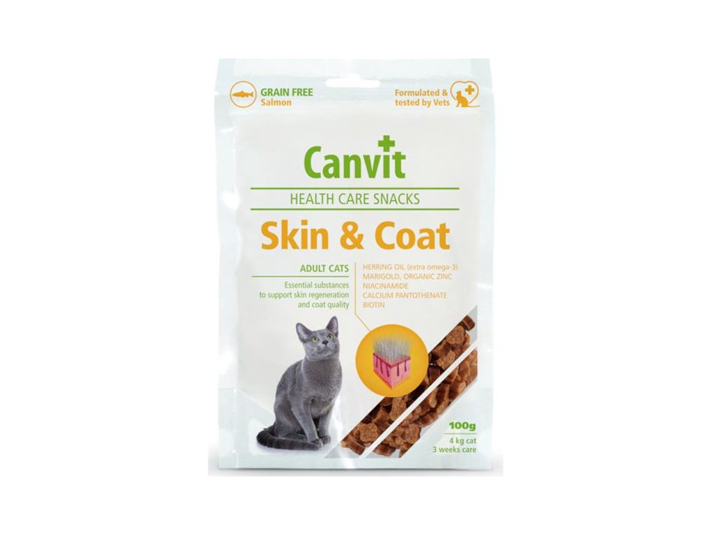 Podpora zdravé kůže a bohaté srsti ve formě chutného pamlsku. Zdravé mlsání pro zdravou kůži a srst.Funkční pamlsek s lososem je plnohodnotným zdrojem vitamínů, minerálů, nenasycených mastných kyselin pro zdravou kůži, lesklou a bohatou srst s neodolatelnou chutí.Kůže a srst je první ochrannou vrstvou pro tělo a ostatní tkáně před vnějším prostředím. Aby kůže mohla plnit svou ochrannou funkci, musí mít pro svůj metabolismus dostatečný zdroj vitamínů, mikroprvků a aminokyselin jako je Biotin, vitamín B2, B3, B5, Zinek a Methionin. Mezi další živinu důležitou pro zdravou a fungující kůži patří omega-3 nenasycené mastné kyseliny, které působí protizánětlivě. Pamlsek Canvit Skin & Coat Health Care Snack zabezpečuje přísun vitamínů, minerálů, omega 3 nenasycených mastných kyselin pro zdravou kůži a lesklou srst, a navíc vaší kočce skvěle chutná.