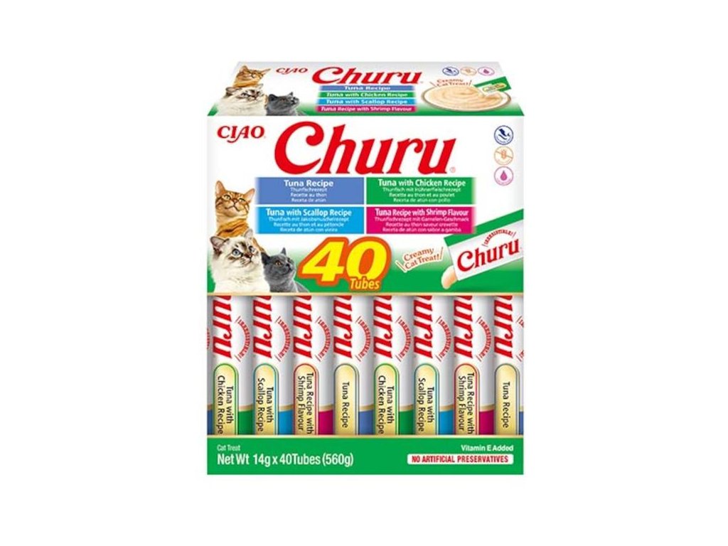 Výběr krémových pamlsků Churu s tuňákem. Balení obsahuje 20 pamlsků: 5× tuňák s krevetovou příchutí, 5× tuňák s lososem, 5× tuňák s hřebenatkou a 5× tuňák s krabí...