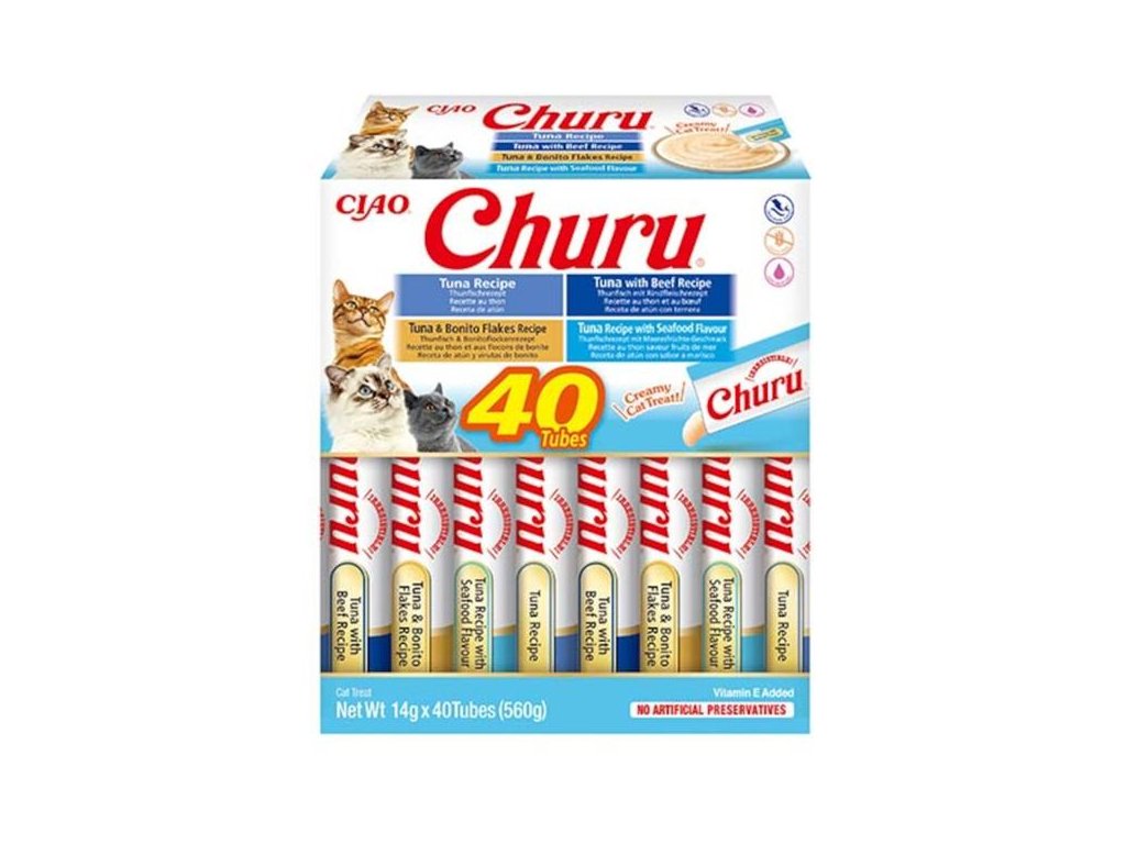 Výběr krémových pamlsků Churu ve variaci s tuňákem. Balení obsahuje celkem 40 pamlsků: 10× tuňák, 10× tuňák s kuřetem, 10× tuňák s hřebenatkou a 10× tuňák s krevetovou...