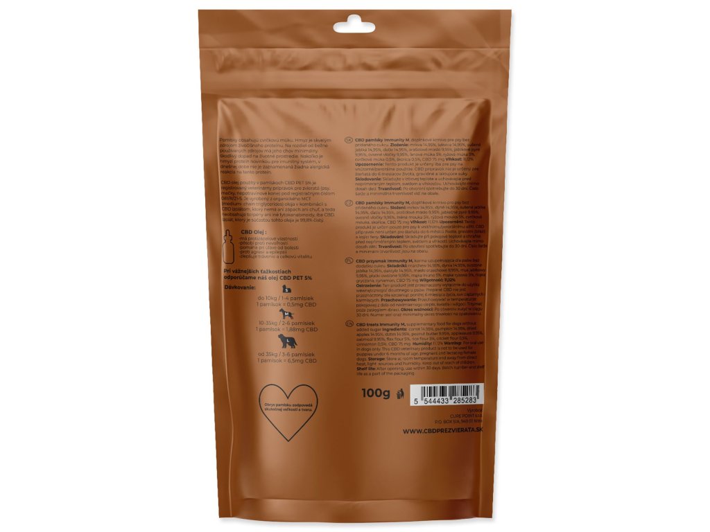 Složení: Mrkev 14,95 %, dýně 12,95 %, sušená jablka 14,95 %, datle 14,95 %, arašídové máslo 9,95 %, jablečné pyré 9,95 %, ovesné vločky 9,95 %, lněná mouka 5 %, rýžová mouka 5 %, cvrččí mouka 0,5 %, skořice 0,5 %, CBD 100 mg, vitamin E (tokoferol) 2,0 %, benzoan sodný.