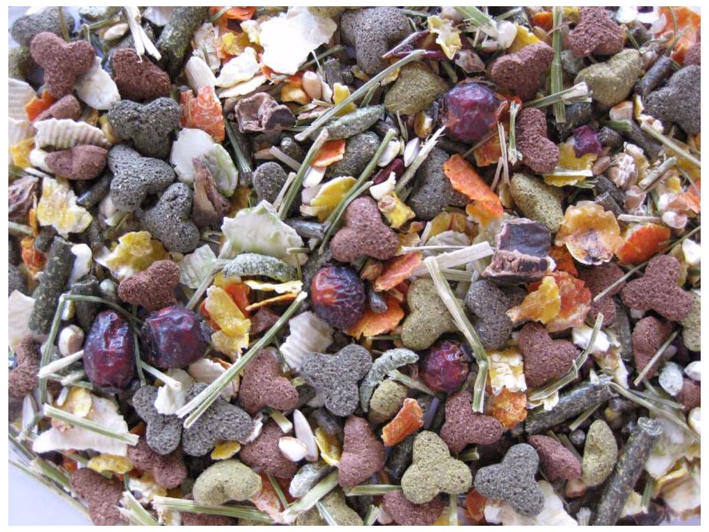 Pestrá a nutričně vyvážená směs obsahující více než 20 přírodních ingrediencí s vysokým obsahem vitamínu C. Vitamín C je pro morčata důležitá živina, protože si ho nejsou schopni vyprodukovat sami. Proto je směs obohacena o složky, které jsou dobrým zdrojem vitamínu C.Obohacena zahradními bylinami, zahrnujícími stonky petržele, stonky naklíčené vojtěšky, celer, tymián, koriandr, pepř. Krmivo rovněž obsahuje vojtěškové stébla. Vojtěška má vysoký obsah vlákniny a proto stimuluje zdravou funkci střev a napomáha vyrovnání střevní flóry.Obsahuje sušené plody šípkové růže, které mají mnoho vlákniny a také přispívají k normálnímu obrušování 100 % přírodní. Vyrobeno z vysoce kvalitního surového materiálů.Složení: deriváty rostlinného původu, obiloviny, zelenina (min 11 % z toho 22 % kousky mrkve, 13 % zelené fazole, 5 % červená řepa), ovoce (min.10 % z toho 30 % šípky, 20 % rohovník), byliny (min.7 %), extrakty rostlinných bílkovin, minerály, semena, různé cukry, oleje a tuky, kvasnice.Analytické složky: hrubý protein 15 %, hrubé tuky 3 %, hrubá vláknina 14 %, popeloviny 6,7 %, vápník 1,05 %, fosfor 0,63 %, lysin 0,24 %, methionin 0,07 %, sodík 0,09 %.