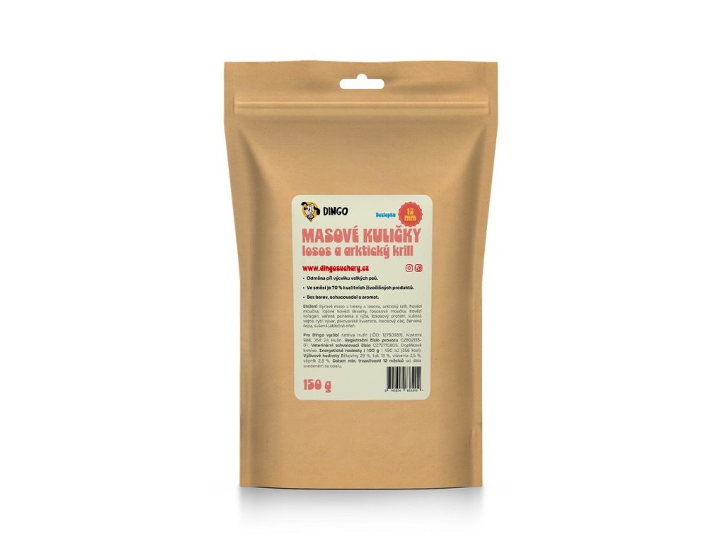 Charakteristika: Náš výcvikový pamlsek pro psy je vařená směs, kde dominantním základem živočišné bílkoviny je hmyzí, mikrobiální, vaječný a kvasniční protein. Tyto suroviny obsahují veškeré esenciální ( nepostradatelné ) aminokyseliny, které jsou pro šelmy zásadní a navíc jsou vysoce stravitelné a to až přes 90 %, což u klasických živočišných mouček je nemyslitelné ( dosahují cca 50 - 70% stravitelnosti ). Pamlsek s hmyzím proteinem se výborně hodí pro psy, kteří trpí potravní alergií na lepek, kuřecí maso, hovězí maso, aj. nebo obecně inklinují k problémům se snášenlivostí klasického krmiva. Směs je tvarovaná do kuliček o průměru 12 mm. Obsahuje 75 % živočišných produktů + 10 % pivovarských kvasnic, zbytek jsou tepelně upravené rostlinné suroviny. Takže hodně masa a málo škrobu. Pamlsek má tmavě hnědouu barvu po použitých surovinách a přirozenou, specifickou masitou vůni. Tuto velikost rozkoušou i mini plemena psů.