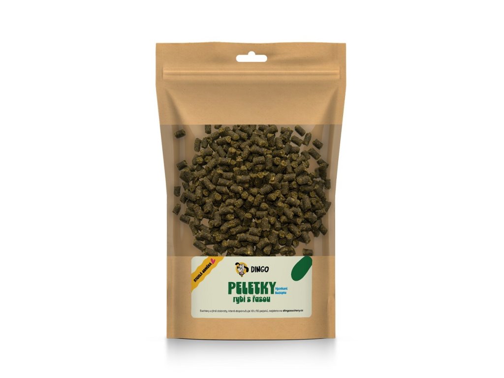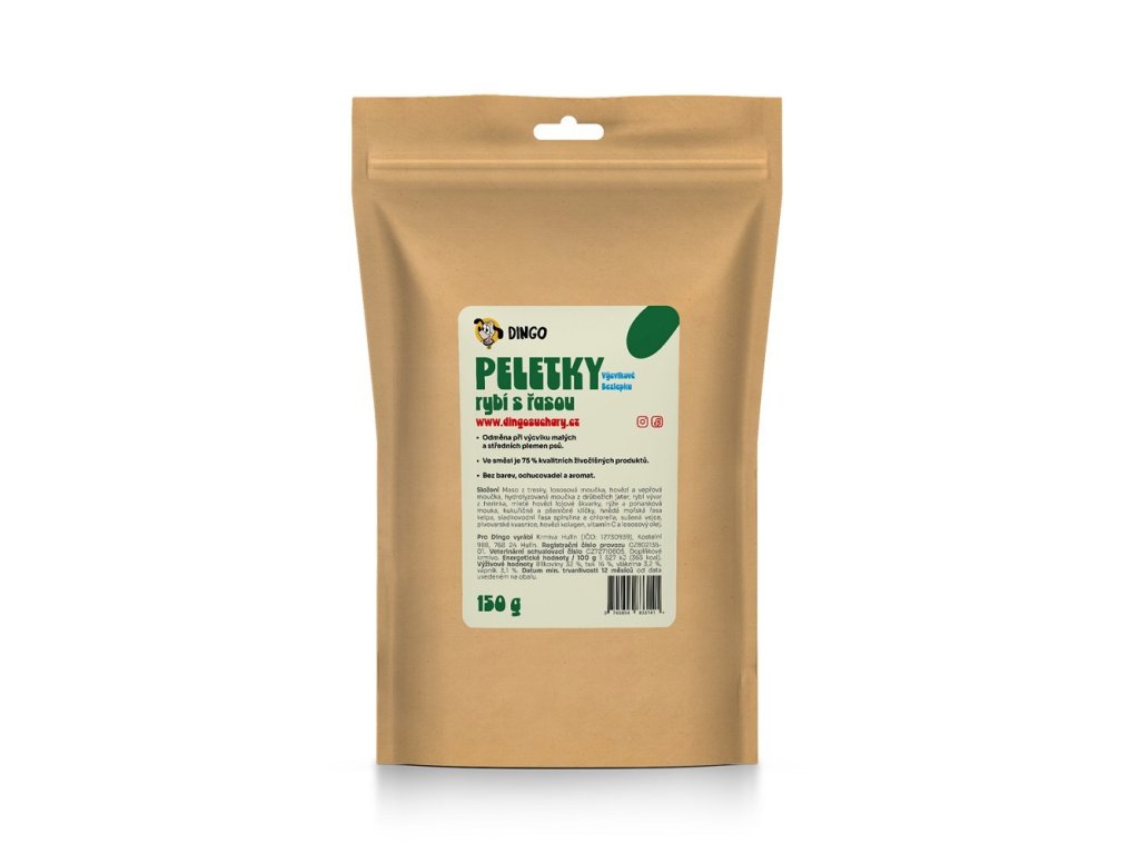 Složení: Základem je syrové rybí maso z Tresky. Dále pak výběrová Lososová moučka. Čistá hovězí a vepřová moučka. Hydrolyzovaná moučka z drůbežích jater, rybí vývar z Herinka a jemně mleté hovězí lojové škvarky. Z rostlinných pojiv to je: rýže a pohanková mouka, kukuřičné a pšeničné klíčky. Specifické vysokohodnotné suroviny: hnědá mořská řasa Kelpa, sladkovodní řasa Spirulina a Chlorella, sušená vejce, pivovarské kvasnice, hovězí kolagen, vitamín C a lososový olej. Neobsahuje obiloviny s lepkem a drůbeží maso!Obsah přirozených živin na 1 kg krmiva: Bílkoviny (NL) - 32 %, Tuk – 18 %, Vláknina - 3,2 %, Popel - 9,5, Vlhkost - 20 %, Škrob - 14 %, Vápník 3,1 %, Fosfor 1,6 %, NaCl 0,6 %, Jód 11,8 mg.Energetická hodnota: 15,27 MJ / kg = 3650 kcal.Charakteristika: Výcvikový pamlsek vyrábíme ve tvaru drobných peletek o průměru 6 mm a délce cca 4 - 6 mm. Jde o vařený produkt z převládající rybí a masové směsi s menším, pouze pro soudržnost nutným rostlinným podílem, který neobsahuje lepek.Ve směsi je 75 % živočišných surovin + 10 % vodních řas. Zbytek tvoří bezlepkové, rostlinné suroviny. Tak je ve směsi dosaženo vysokého podílu masa s velmi málým obsahem škrobu. Pamlsek má tuhou, gumovitou konzistenci, zeleno-hnědou barvu, kterou mu dodávají vodní řasy a intenzivní masitou vůni. Bez barev, ochucovadel a aromat.