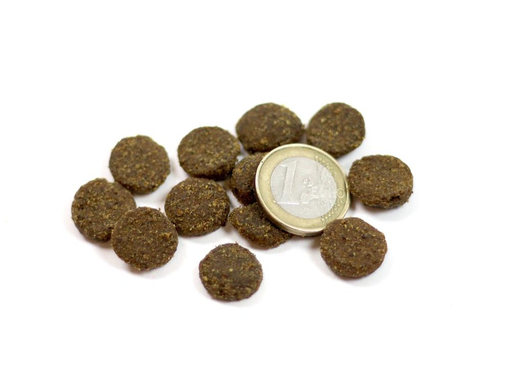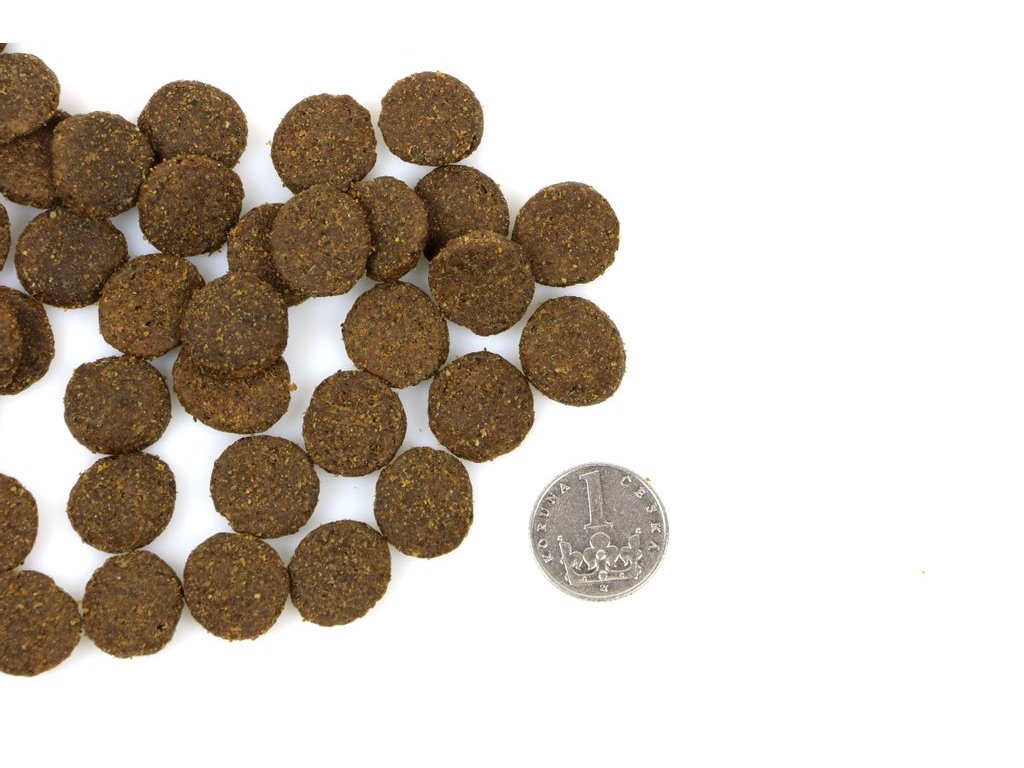 Hrubá bílkovina 32%, hrubé tuky 15%, hrubá vláknina 3%, anorganické složky 6,5%, vlhkost 10%, vápník 1,3%, fosfor 1,0%, Omega 3 0,4%, Omega 6 1,95 %.