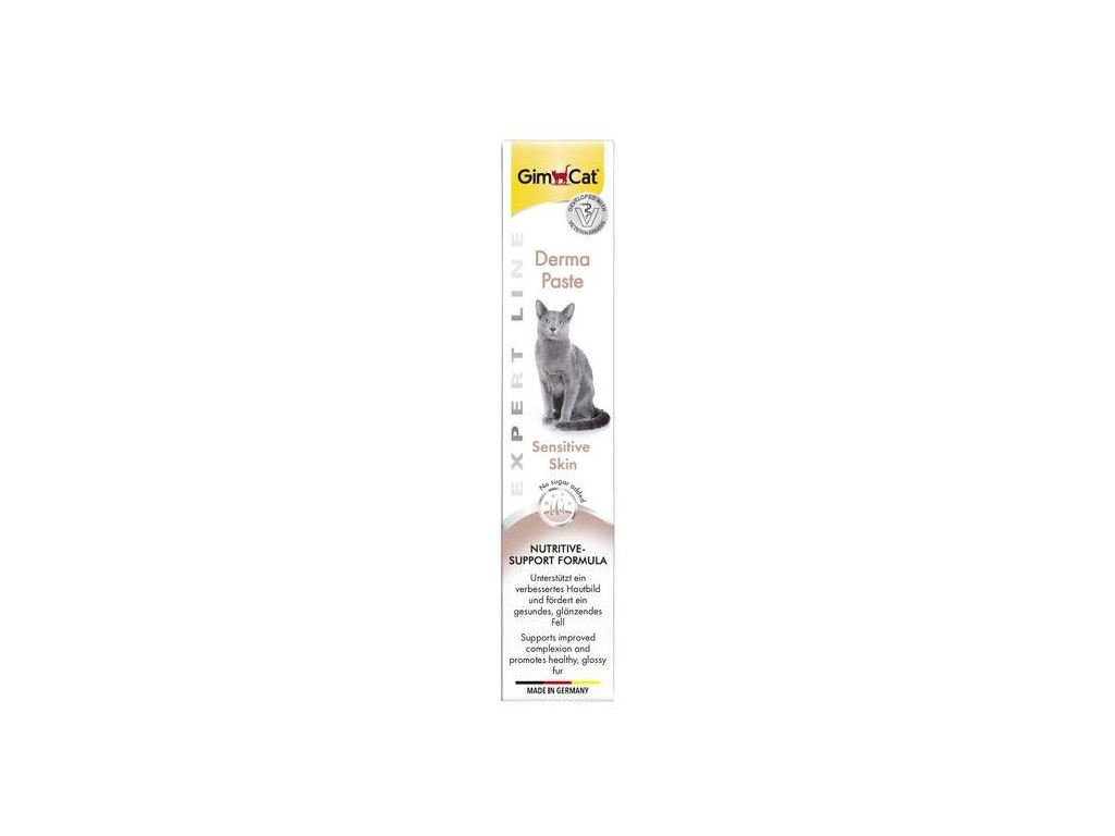 Problémy s kůží a srstí u koček mohou mít mnoho příčin a jsou nejen kosmetickou vadou, ale v první řadě velkou přítěží pro Vašeho tygříka. Gimcat Derma Pasta byla speciálně vyvinuta, aby podporovala zdravou kůži a lesklou srst. Doplňkové krmivo obsahuje vysoce kvalitní suroviny pro podporu kůže a srsti. Takzvaný Nutritive-Repair Complex zásobuje Vaši kočku důležitými živinami, které vykonávají různé funkce. Pasta obsahuje mj. vitamíny, např. vitamíny B, které mohou mít pozitivní vliv na zdravou kůži a srst. Betaglukany mohou mít regulující a uklidňující účinek na kůži, zatímco zinek a biotin mají pozitivní vliv na elasticitu, pevnost a lesk kůže a srsti.