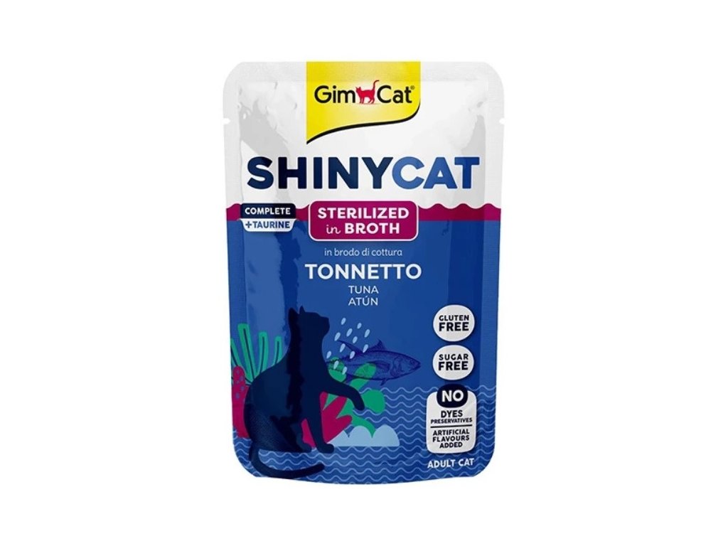Shiny cat kapsička obsahuje jen ty nejchutnější kousky masa. Maso je připravováno v lahodném masovém vývaru. Speciální receptura s tuňákem má vyváženým poměrem vápníku a fosforu a zvýšeným obsahem vlákniny je určen pro kastrované kočky. Křehké kousky tuňáka vařené ve vývaru.