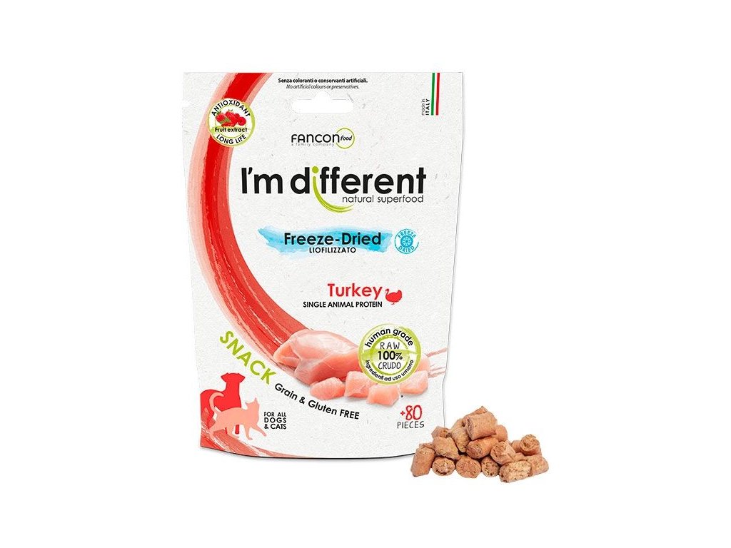 Složení: čerstvé krůtí maso 65 %, čerstvá krůtí játra a čerstvé krůtí srdce 30 %, inulin, zeleninové aroma, extrakt z rozmarýnu, směs tokoferolů (přírodní konzervant), kvasnice, směs extraktu ze sušeného ovoce (extrakt z hroznových semínek, divoká borůvka, antioxidant kvercetin, resveratrol pro posílení imunity, divoká borůvka, brusinka, višeň, sušená švestka, semena malin, jahoda) 0,025 %