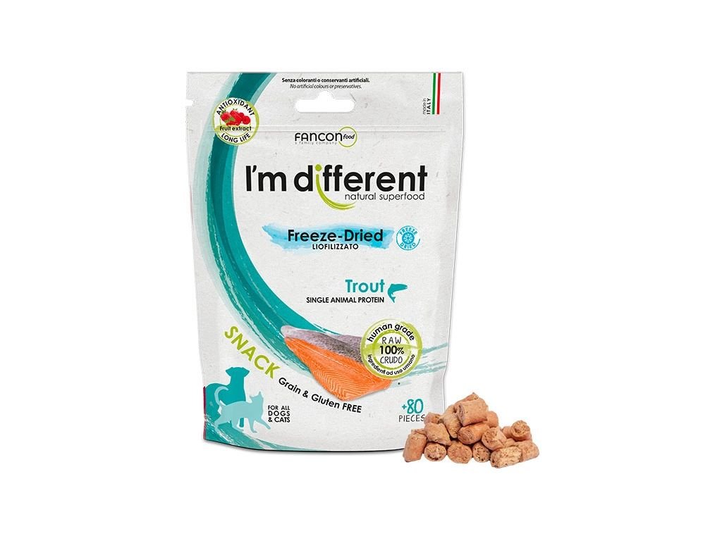 Složení: čerstvý pstruh 95 %, inulin, zeleninové aroma, extrakt z rozmarýnu, směs tokoferolů (přírodní konzervant), kvasnice, směs extraktu ze sušeného ovoce (extrakt z hroznových semínek, divoká borůvka, antioxidant kvercetin, resveratrol pro posílení imunity, divoká borůvka, brusinka, višeň, sušená švestka, semena malin, jahoda) 0,025 %