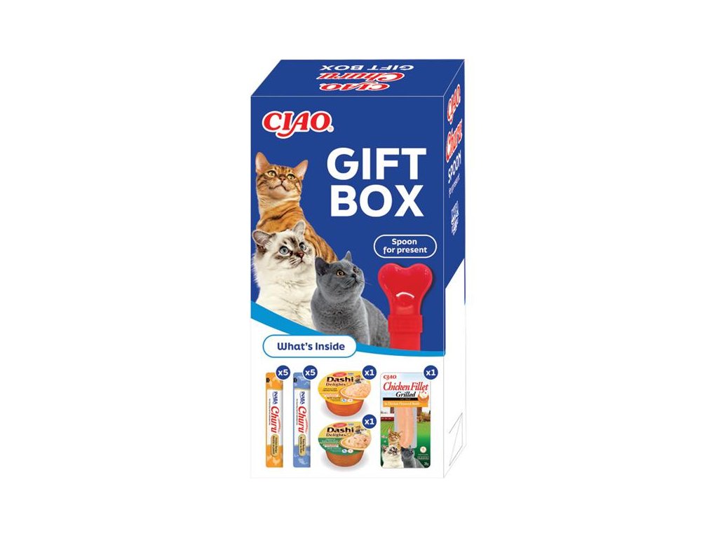 Udělejte své kočce radost a pořiďte jí dárkové balení obsahující celkem 13 různých pamlsků a praktickou servírovací lžíci, se kterou bude podávání lízacích past Churu ještě větší zábava!Balení obsahuje: 10 krémových pamlsků Churu (5× kuře a 5× tuňák), 2× polévku Dashi Delights (kuře se sýrem a kuře s tuňákovými vločkami), grilovaný kuřecí filet a lízací lžičku.
