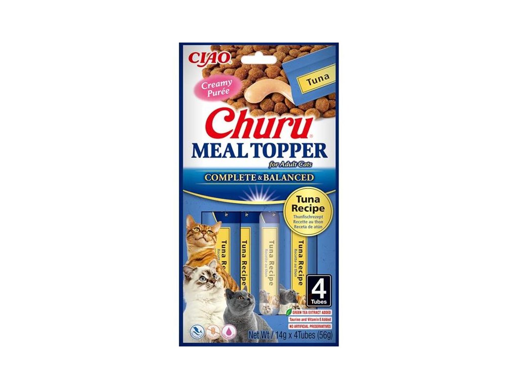 Zpestřete kočkám suché krmivo lahodnou krémovou polevou s tuňákem. Jemné pyré Churu Meal Topper je možné používat i jako kompletní a vyvážené krmivo nebo lízací pamlsek. Je vyrobené ze surovin v kvalitě pro lidskou spotřebu, neobsahuje žádné obiloviny, konzervační látky ani umělá barviva. Má vysoký obsah vody, čímž přispívá k hydrataci organismu a celkovému zdraví koček. Navíc je obohaceno taurinem, extraktem ze zeleného čaje, vitamíny a minerály.