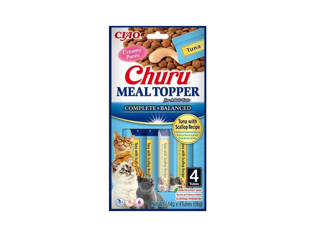 Zpestřete kočkám suché krmivo lahodnou krémovou polevou s tuňákem a hřebenatkou. Jemné pyré Churu Meal Topper je možné používat také jako kompletní a vyvážené krmivo nebo lízací pamlsek. Je vyrobené ze surovin v kvalitě pro lidskou spotřebu, neobsahuje žádné obiloviny, konzervační látky ani umělá barviva. Má vysoký obsah vody, čímž přispívá k hydrataci organismu a celkovému zdraví koček. Navíc je obohaceno taurinem, extraktem ze zeleného čaje, vitamíny a minerály.