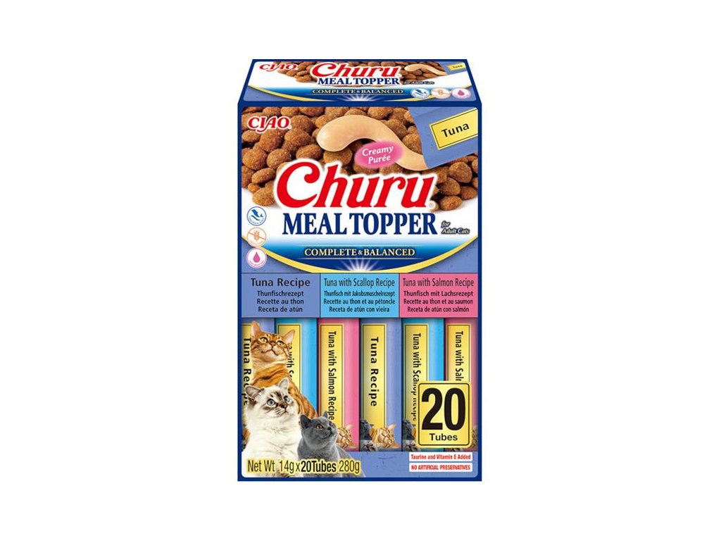 Kočky už obyčejné suché krmivo nebaví? Zpestřete jim stravu krémovým Churu Meal Topperem s tuňákem, který budou milovat. Churu Meal Topper je kompletní a vyvážené krmivo pro dospělé kočky vyrobené ze surovin odpovídající lidské kvalitě. Churu Meal Topper je vyroben z tuňáka a neobsahuje obiloviny, konzervační látky ani umělá barviva. Má vysoký obsah vody, což přispívá k celkovému zdraví koček. Navíc je obohacen o taurin, extrakt ze zeleného čaje, vitamíny a minerály. S Churu Meal Topperem bude krmení chutnější a zábavnější než doposud.