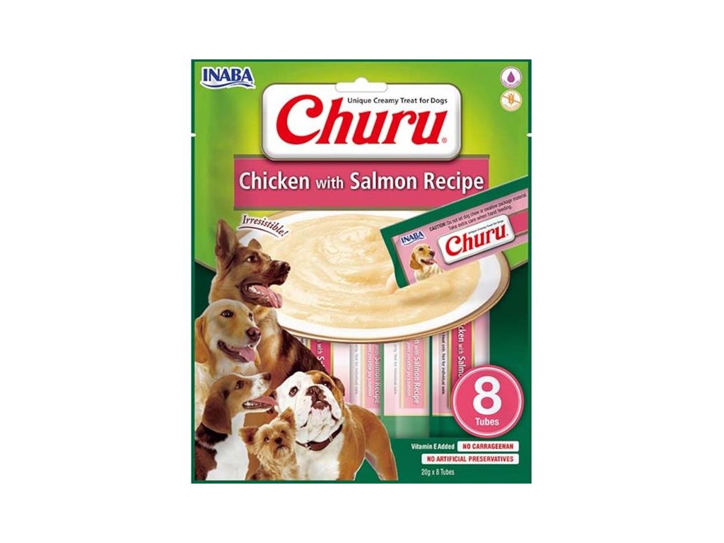 Churu masové pyré pro psy s kuřecím z farmářského chovu a lososem.