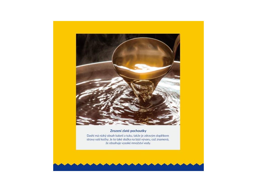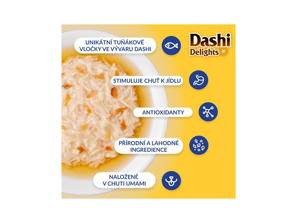 Kuřecí maso, tuňák a jemné tuňákové vločky v lahodném vývaru. Daši je tradiční japonský rybí vývar z tuňákových vloček známý svou výjimečnou, lahodnou chutí. Jeho zařazení do jídelníčku vaší kočky může dodat krmení nový rozměr a učinit z něj skutečný zážitek. Nejde jen o chuť, daši poskytuje důležité živiny včetně vitamínů a minerálů a díky nízkému obsahu kalorií a tuku je zdravým doplňkem stravy. Je to produkt na bázi vývaru, obsahuje tedy vysoké množství vody, čímž přispívá k hydrataci organismu a k prevenci potíží močového ústrojí.Všechny produkty Inaba jsou bez obilovin (grain-free), zbytečných ingrediencí a pochybných přísad a jsou vyrobené z pravého mořského tuňáka a kuřat chovaných na farmách. Jsou hydratující, výživné a vždy lahodné.