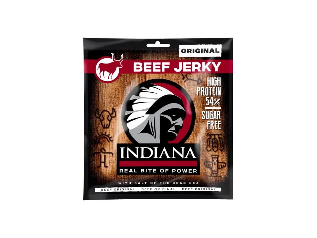 Jste připraveni na šťavnaté hovězí? Tohle je nejoblíbenější jerky bledých tváří – náčelníkova originální receptura s nezaměnitelnou evropskou slanou chutí masa. Stačí otevřít sáček a zakousnout se! Indiana Jerky Vám dodá pořádný kus energie při zachování minimální hmotnosti.