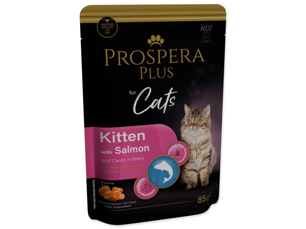 Kompletní krmivo pro koťata ve věku od 4 týdnů do 1 roku v podobě kapsičky s lososem a mrkví v omáčce.