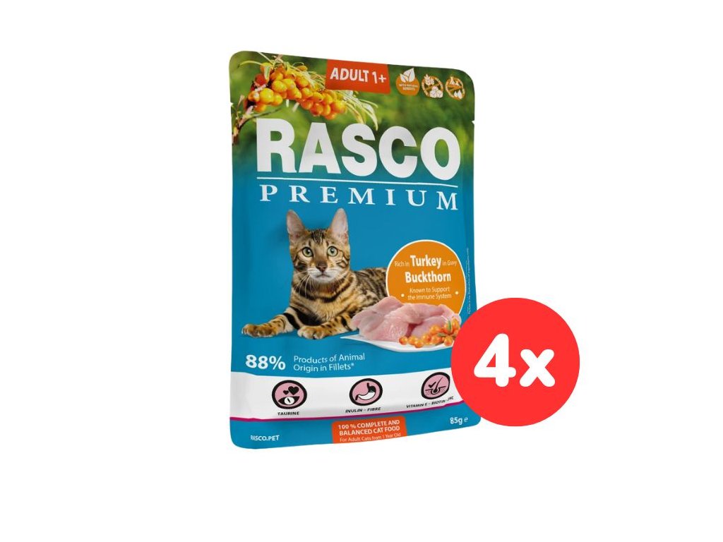 Složení: maso a výrobky živočišného původu (88%* ve filetkách, z toho 40,6% krůtí, 27% vepřová játra, 14,5% vepřové, 4,8% hovězí, 1,1% drůbeží) 1,8% minerály, oleje a tuky (0,5% lněný olej), vedlejší výrobky rostlinného původu (0,6% škrob, 0,4% inulin, 0,2% vláknina), rakytník 0,05%.