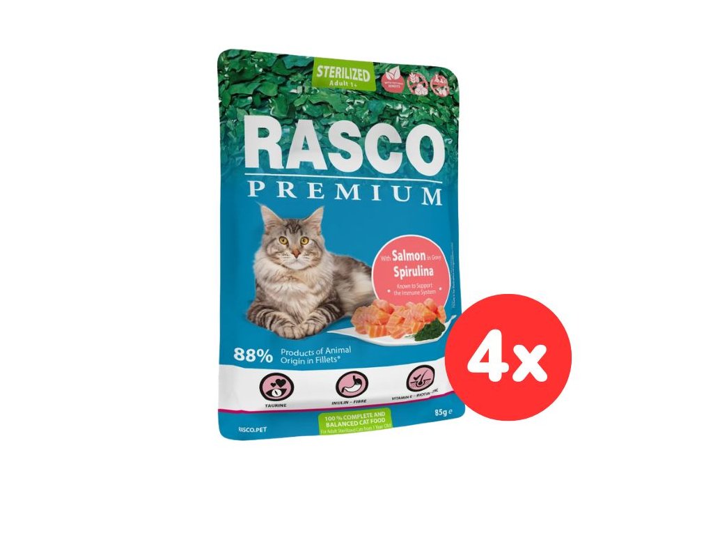 Složení: maso a výrobky živočišného původu (73,5%*ve filetkách, z toho 27% vepřová játra, 14% vepřové, 8,5% drůbeží, 20% kuřecí, 4% hovězí), ryby a vedlejší výrobky z ryb (14,5% losos*), 1,8% minerály, vedlejší výrobky rostlinného původu (0,6% škrob, 0,4% inulin, 0,2% vláknina), 0,05% spirulina.