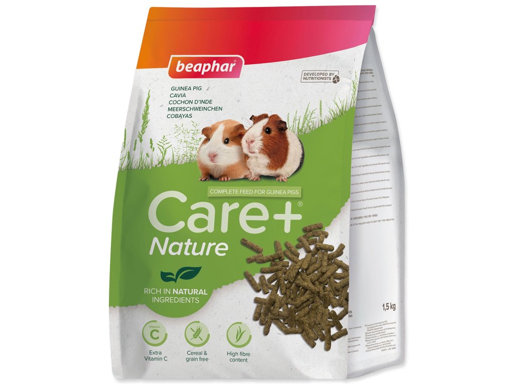 Beaphar Care+® Nature je kompletní bezobilninové krmivo pro morčata s vysokým obsahem vlákniny a bohatým na přírodní složky. Speciálně tvrzené pelety odpovídají přirozené stravě morčat a mají přidaný vitamín C, protože morčata si ho neumí sama syntetizovat.