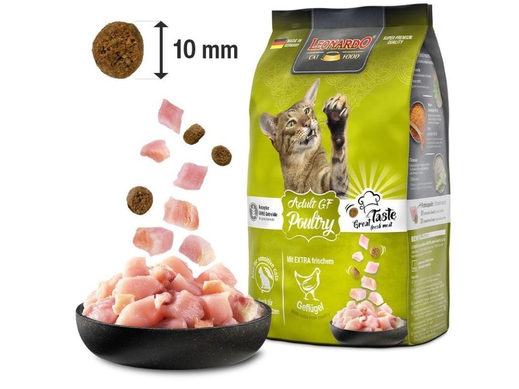Leonardo Adult Grain Free je bezobilná receptura pro dospělé kočky. Obiloviny jsou známým alergenem, který způsobuje kožní vyrážky, špatné trávení a obecně horší prospívání kočky.