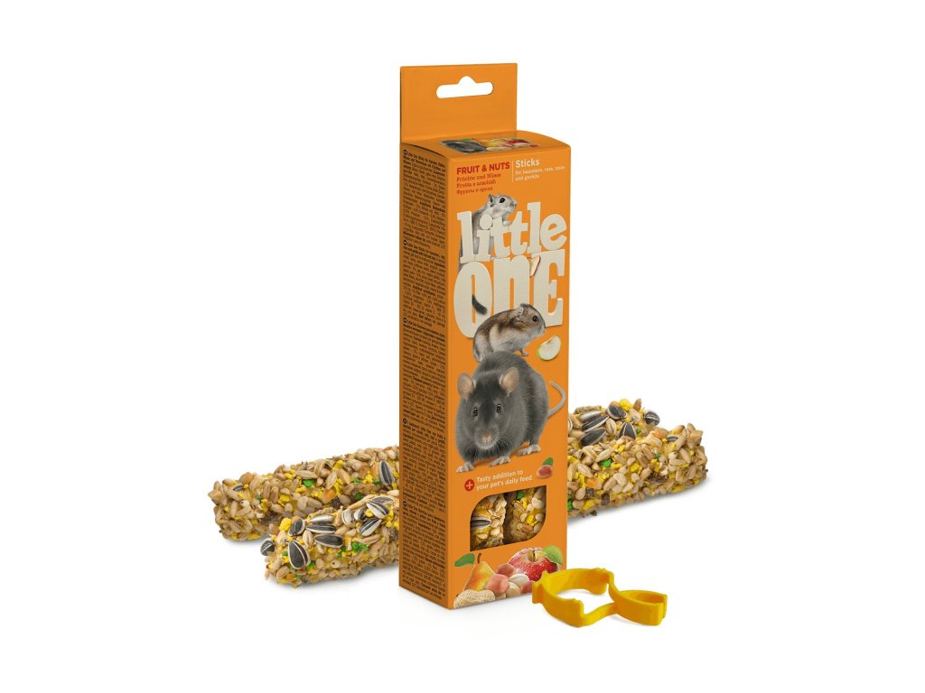 Little One tyčinky s ovocem a ořechy jsou doplňkové krmivo pro křečky, potkany, myši a pískomily s ovocem a ořechy. Velice chutná, pestře složená a praktická pochoutka ve formě tyčinky na okusování. Obsahuje obiloviny a ovoce. Obsah balení 2 x 60 g.