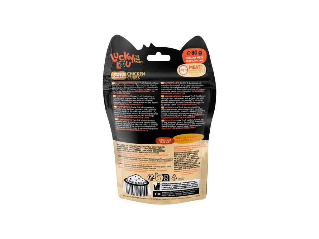 Kdo říká, že s jídlem se nehraje? Lucky Cubes vás přesvědčí o opaku! Lucky Ones Cubes jsou šťavnaté kostičky kuřecího masa, které se perfektně hodí pro časté odměňování a hru s vaší kočkou. Díky své velikosti a neodolatelné vůni jsou skvělé pro schovávání do různých hraček, odkud je kočka bude s nadšením lovit. Snadno tak zabavíte sebe i svou kočku při dlouhých večerech. bez obilovin, bez lepku, bez GMO, bez přidaného cukru s L-karnitinem, který podporuje fyziologickou přeměnu tuků na energii obsahují až 87 % živočišných ingrediencí pro kočky všech věkových kategorií, od koťat až po seniory vyrobeno ve Švýcarsku k dostání ve 4 lahodných příchutích a 1 speciální „mix“ verzi Aby zůstaly déle čerstvé a voňavé, schovávají se v extra zábavném, a hlavně extra praktickém znovu uzavíratelném balení. Složení: kuřecí maso 71,4 % (svalovina, škvarky, tuk, játra), brambory, glycerin, lignocelulóza, vaječný bílek 1 %, minerální látky, rozmarýnový extrakt Analýza: hrubé bílkoviny 23,1 %, hrubé oleje a tuky 19,3 %, hrubé popeloviny 3,3 %, hrubá vláknina 4,5 %, vlhkost 20 % Doplňkové nutriční látky na 100 g: L-karnitin (3a910) 6250 mg Hmotnost: 80 g