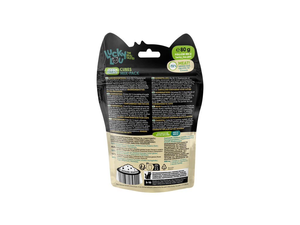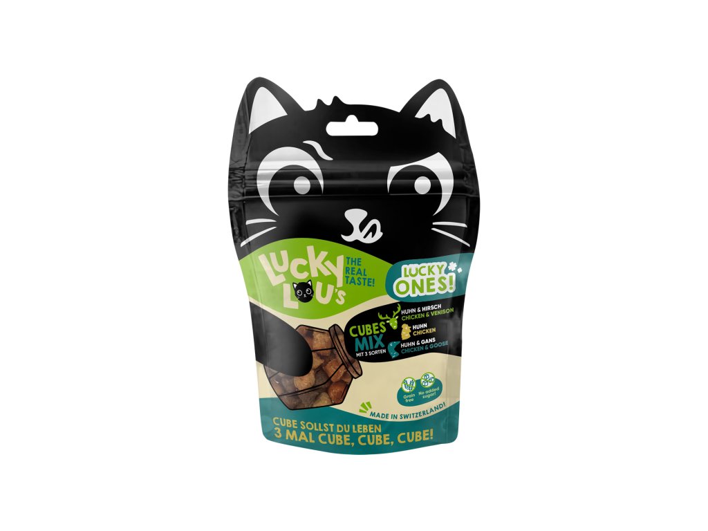 Lucky Ones Cubes jsou šťavnaté kostičky kuřecího, husího a jeleního masa, které se perfektně hodí pro časté odměňování a hru s vaší kočkou.